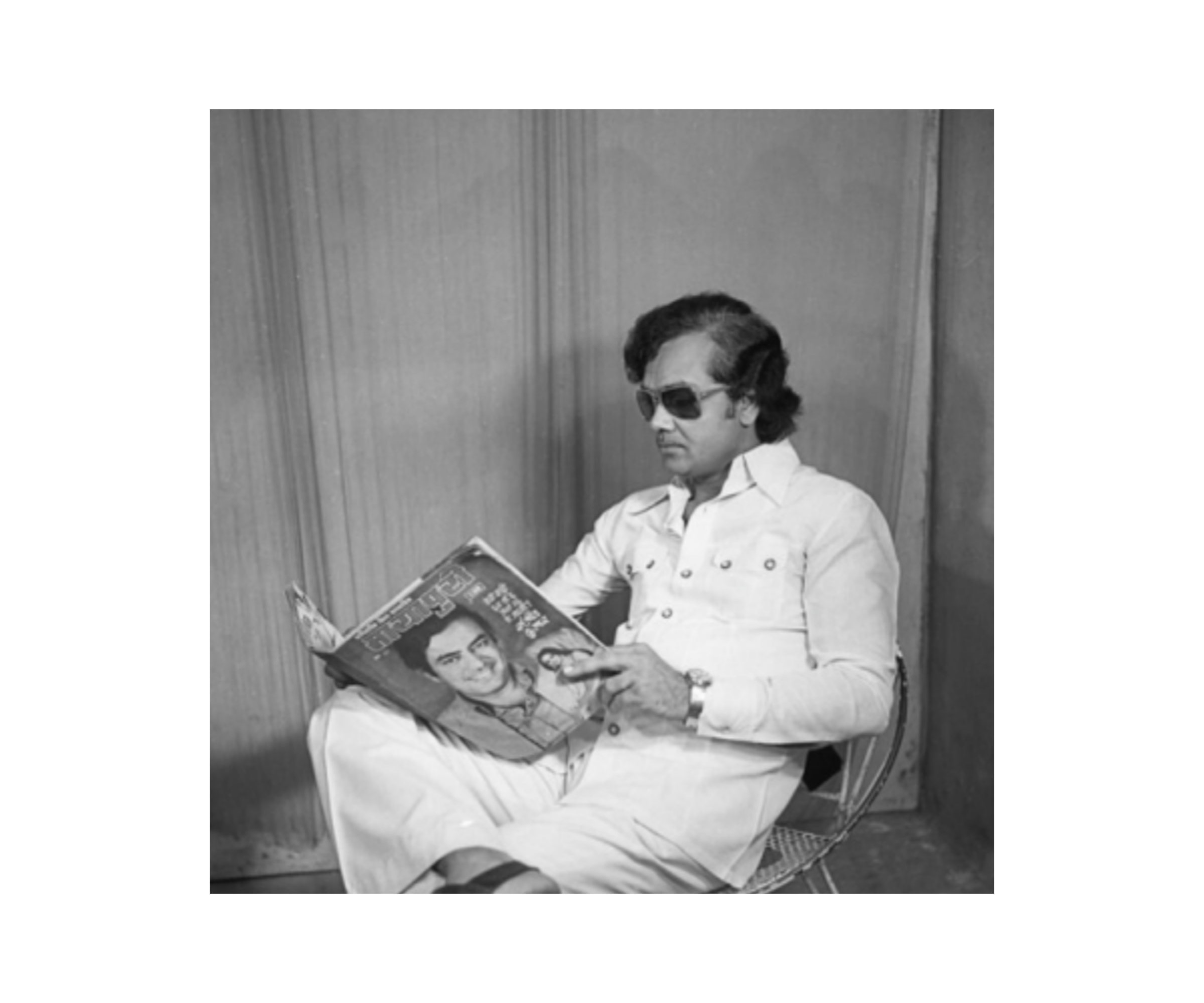 He spoke to his sitters at great length about the general sentiments they wanted to convey and then helped them embody those by miming possible poses himself. “From the moment they walked in, I had to understand how they wanted to be seen,” Punjabi says. In one portrait, a man is photographed reclining on a chair and reading an issue of Mayapuri, a popular Hindi-language entertainment weekly that was launched in the mid-1970s. The actor on the cover, Sanjeev Kumar, was a household name during this time, and the sitter’s admiration for him prompted this arrangement. The portrait conveys the sitter’s fandom, yet his own style — the large prop sunglasses, combed-over hair and open shirt button — also pay homage to Kumar. Here, the ordinary pleasure of reading the magazine blurs into an extraordinary emulation of its cover star’s glamour.