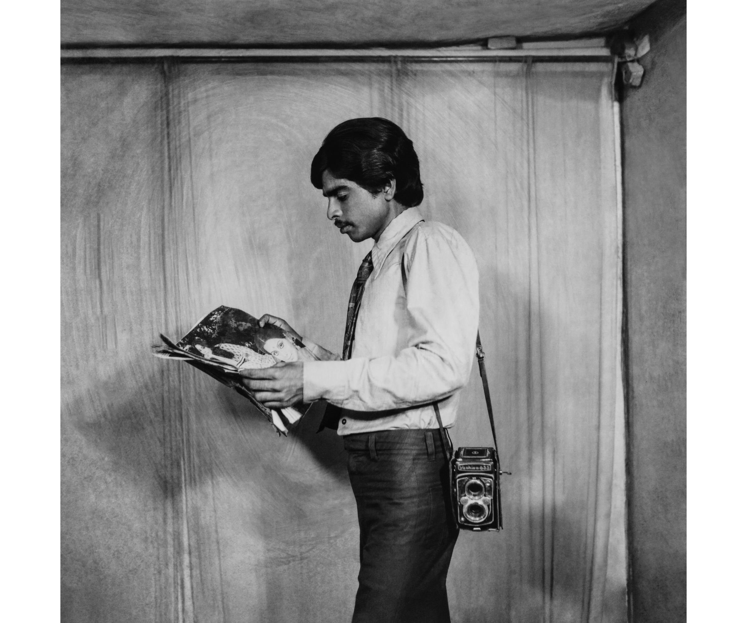 In another portrait, Punjabi’s client embodies a different kind of aspirational self-assuredness. The young man stands in profile reading a magazine with a camera hung from his left shoulder.
