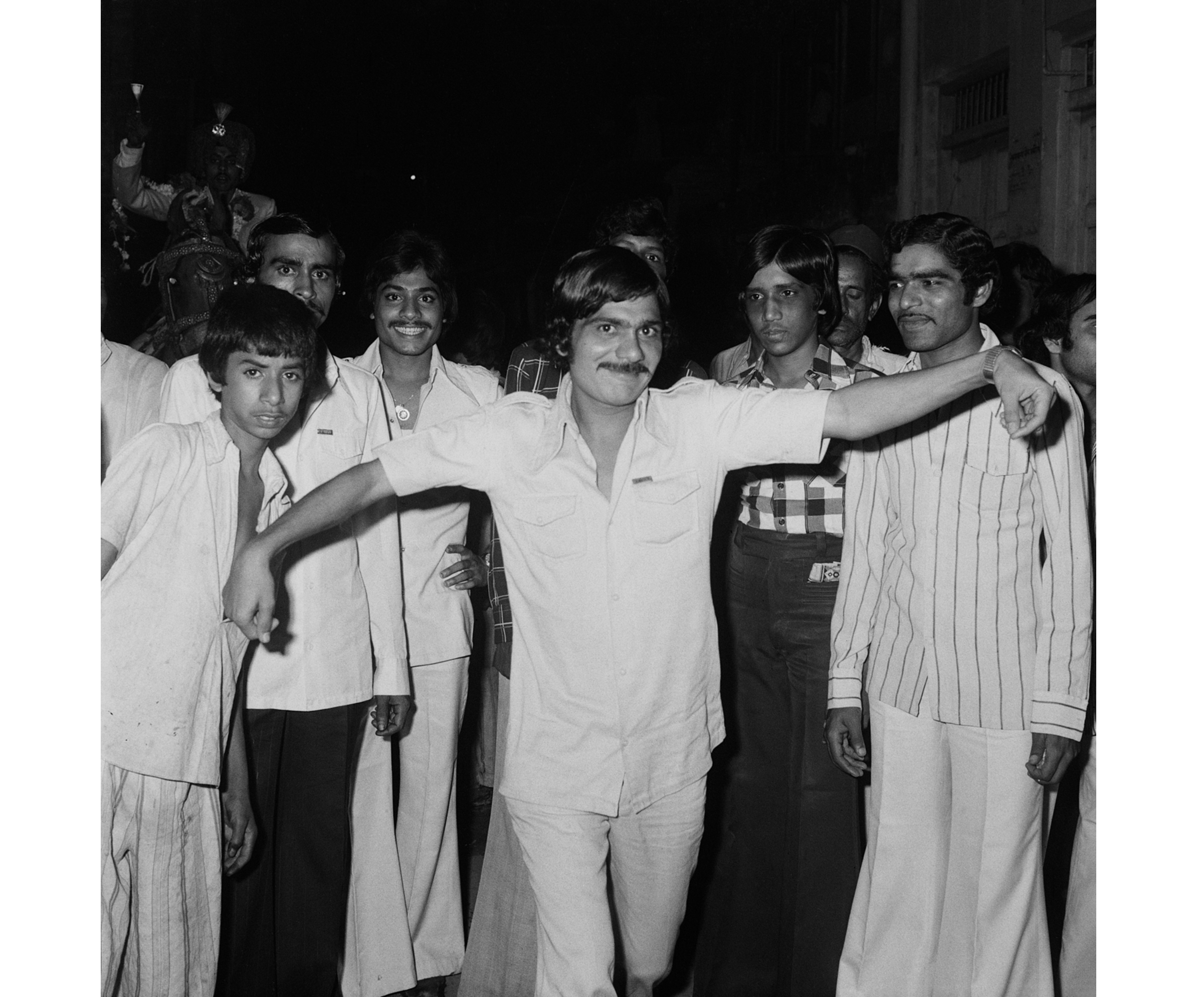 Finally, there were Punjabi’s outdoor photographs, which don’t comprise a significant portion of his archive but nonetheless present us with a necessary connection to the community in which he has lived. Owing to the training from his freelance photography days, Punjabi was keen-eyed and quick-footed, rarely without a camera on hand. In one outdoor image he made during a wedding procession in 1980, a smiling man appears mid-dance with outstretched arms, framing the men standing behind him.