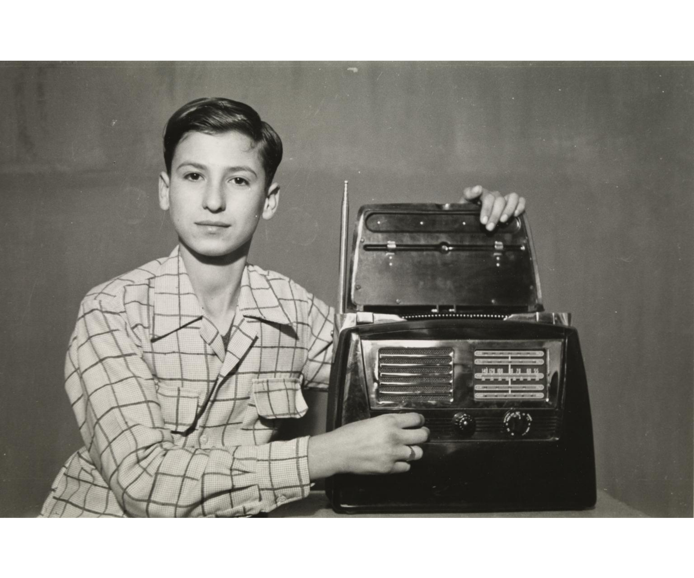 In one particular image, Madani’s sitter, a young boy named Muwafaq el Rawas, pretends to turn the knobs on a radio, mirroring an image of Punjabi’s, in which two unnamed men pose holding a smaller transistor radio — the first in Nagda — up to their ears. In responding to the fervor for new technologies in Sidon and Nagda, both photographers were able to bring the objects, and the cultural capital they exhibited at the time, into the photographic space.