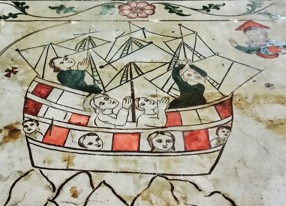 Stylistically, the murals are a fascinating hybrid. Vibrant reds and greens fill bold, black outlines, echoing the aesthetics of Indian folk painting, as seen in the charmingly direct depiction of Noah’s Ark. Yet this is blended with a distinct West Asian aesthetic of the 12th and 13th century, inherited from the Syriac tradition. The figures are often rigid and frontal, with large, wide-open, almond-shaped eyes that gaze into a timeless, sacred space. Christian works of art often reflect doctrinal debates. In the Cheppad murals, certain prominent Nestorian beliefs are clearly evident, such as the depiction of Christ’s suffering and His human form alongside His divinity, echoing the doctrine of Christ as both fully man and fully God. Yet, assigning the entire mural to a single tradition is difficult, as its many themes display a blend of influences. This likely points to collaboration or contact between different Christian traditions.