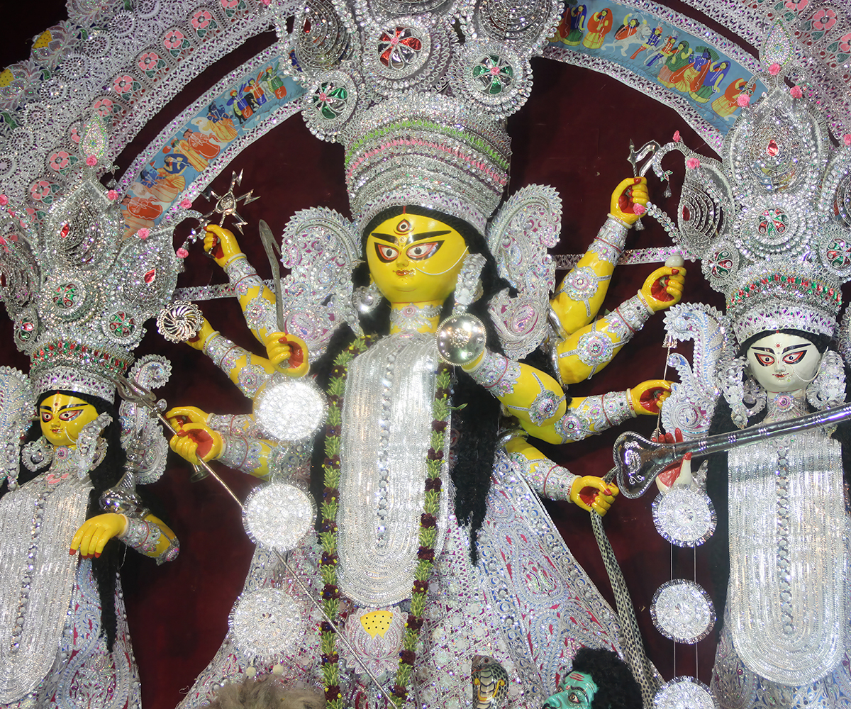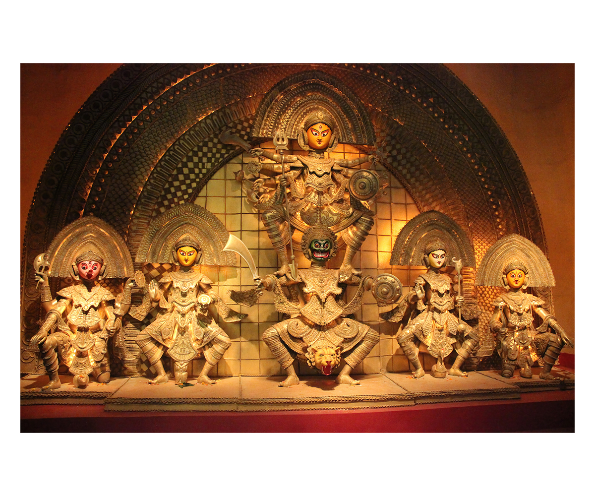 Today, themed or topical pandals take forms as diverse as Rajasthan’s fortresses, Mughal monuments, European architectural wonders, even international war zones; they also ride the waves of contemporary issues like the Covid-19 pandemic, climate change and women empowerment. Beyond wood, bamboo and jute, pandal-designers now use materials ranging from papier mache, metal alloys, utensils and found objects, to seeds, nylon mesh and automobile parts. Preparations for some of the bigger pandals often begin a year in advance and many occupations like idol-making, costume-design as well as preparing music and performances for pujo have now become year-round activities, generating income for hundreds of thousands of Bengalis.