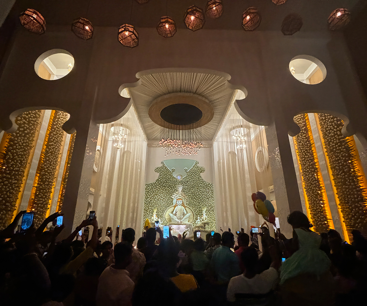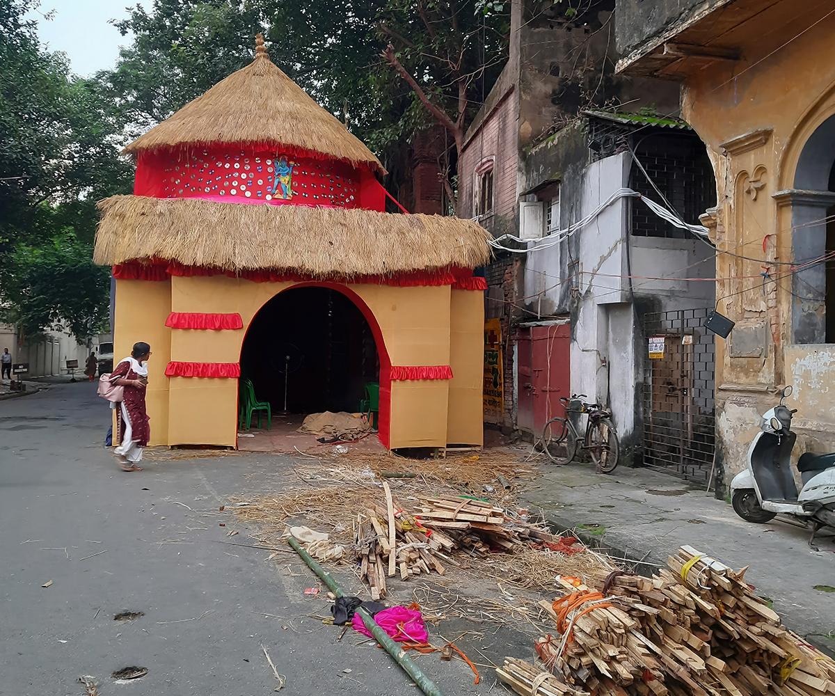 In a city like Kolkata, hundreds of local clubs and committees start preparing their respective pandals weeks or months before pujo. Bylanes, playgrounds and other civic spaces begin to sprout often expansive and imposing structures of bamboo, metal, tarpaulin and cloth — until, during the five-day festivities, the city is a maze of walk-through installations that occupy thoroughfares and neighbourhood squares. Designed along the plan of a typical Indian temple, the pandal contains a stage at one end to hold the idols and host rituals — thus representing the garbhagriha (sanctum sanctorum) — with the rest of the enclosed space variously serving the functions of communal worship, revelry, and dance and theatrical performances, much like the temple’s mandapa or gathering hall. The outward similarities to the traditional temple, however, end here.