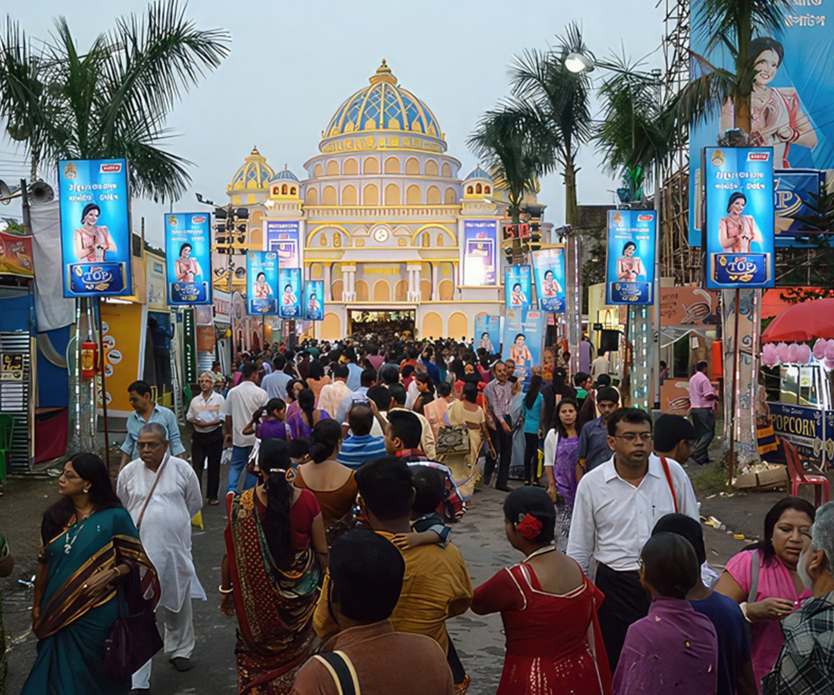 Replacing the intricately carved toranas or sacred gateways are lightweight arches and vinyl screens saturated with corporate logos — from jewellery and cement brands to sweet-shop chains — the landscape of temples is also a commercial canvas. Every year, more than 10,000 pujos are organised annually in the state of West Bengal, and corporate spending in Kolkata alone is between 650–950 crores INR (80-120 million USD) per year. Pandals vie with each other for footfall and for corporate-sponsored awards — and so innovation, artistry, novelty, scale and memorability come to the fore.