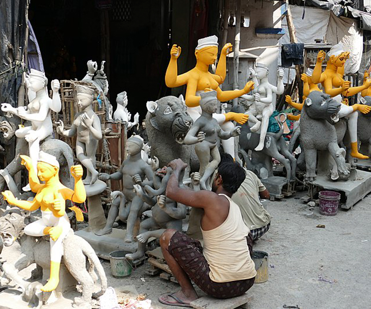 Meanwhile, the making and representations of the goddess and her cosmic children, Lakshmi, Saraswati, Ganesha and Kartik, have changed little over centuries; the elongated fish-shaped eyes and graceful countenance of today’s sarbajanin (community) idols follow those that featured in the eighteenth- and nineteenth-century sabeki (traditional) pujas privately hosted in the sprawling mansions of Bengal’s landed elites. While skilled and unskilled workers raise the structures and installations of the pandal, the icons that will occupy its sacred centre are created by Bengal’s premier patuas (idol makers), some of whom are descendants of nineteenth-century Kalighat patachitra artists.