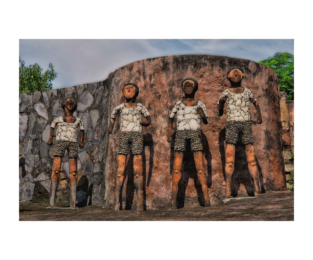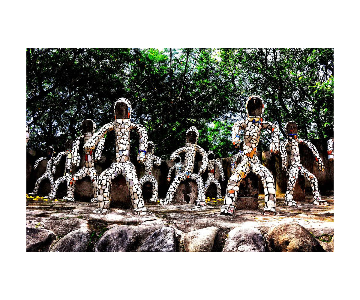 The garden itself is a view into a whimsical vision, one replete with large sculptures of figures made from broken bangles and spacemen suits rendered in waste material. It may be interesting to consider the Rock Garden and its sensorial spaces as being created in parallel with the building of Chandigarh itself, offering us a slightly left-of-field vision of the spaces surrounding the city. The use of recycled and reused materials that would have met their fate in an industrial landfill further adds to the fascinating possibilities of building an oppositional space to the urban city. Chand, by his admission, was inspired by the naturalistic landscape of locally grown flora and fauna that he had grown up with in his childhood. Working at the Public Works Department using materials such as gravel and concrete daily, Chand created an uncanny vision of nature in the middle of a city using the very waste generated in its inception.