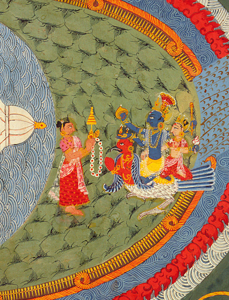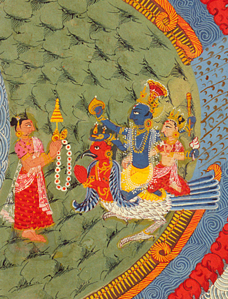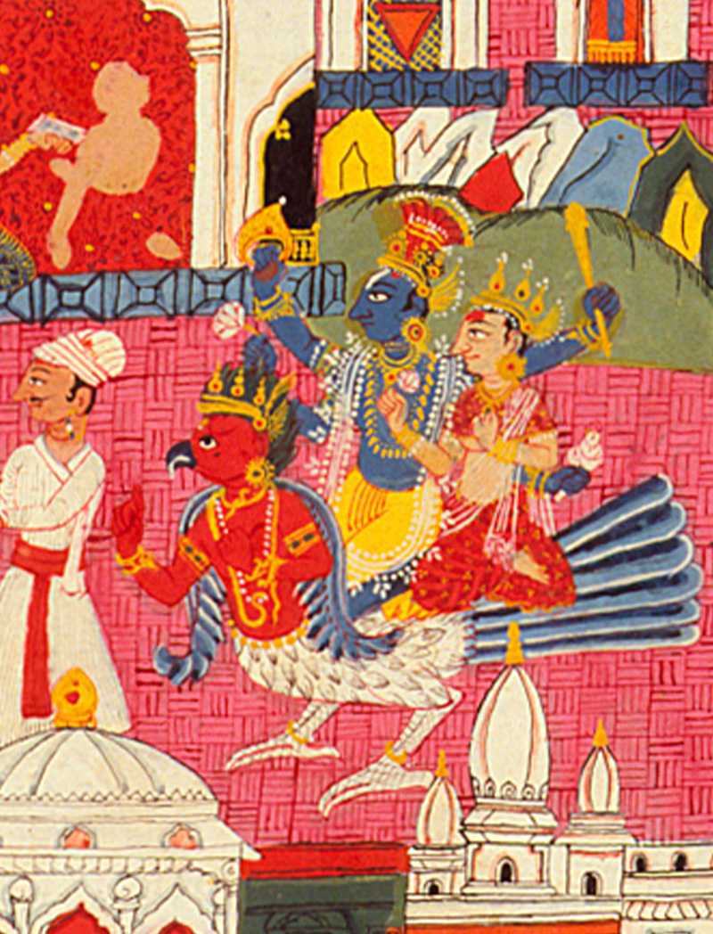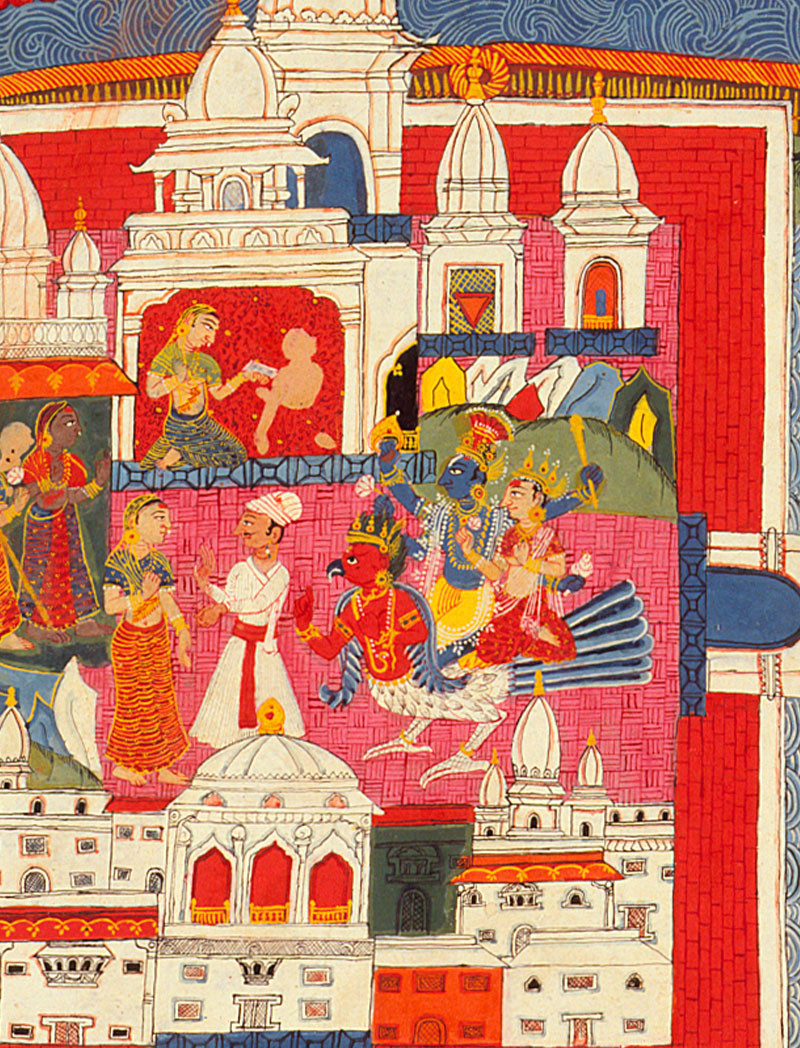 In this miniature painting, Krishna and his consort descend from the skies on Garuda, his bird-like mount, to visit the palace of the demon Narakasura, the mythical asura king of Pragjyotisha (believed to be modern-day Assam) amidst great ceremony.