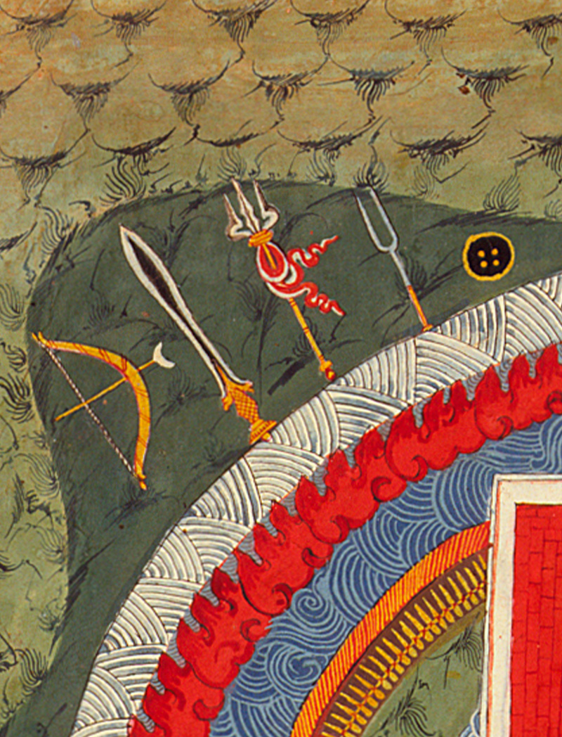 The tortoise, as a symbol of the earth as a whole, often appears in South Asian — especially Hindu — cosmographical texts, from the vedic Brahmanas (mid-first millennium BCE) to the later Puranas (fourth–sixth century CE). According to this representation, the tortoise’s domed shell is heaven and the flat underside is the earth. Another noteworthy feature of the painting is the plotting of the water bodies in concentric shapes. There is the central one in a blue half-moon pattern, on which the palace rests. There are also the peripheral oceans, one in blue swirls and the other in a white basketweave pattern, separated by a ring of red mountains.
