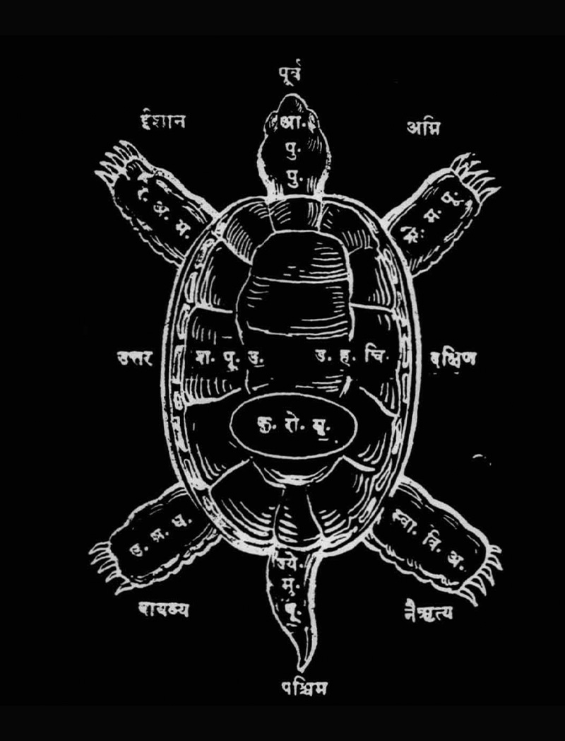 Why, of all the animals, a tortoise as the earth? One possibility is that the tortoise was one of the preserver Vishu’s avatars. Further, the kurmanivesha (tortoise abode) is central to Hindu astrology, wherein the body of the tortoise would be divided up into nakshatras (constellations) that influenced the regions occupying a certain body part. For instance, the head often represented the eastern region of the earth.