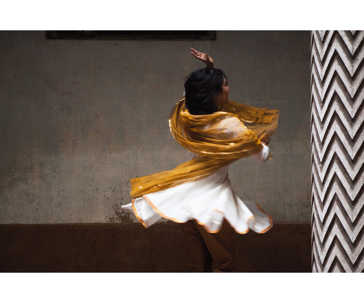 Still air comes to life — a gentle breeze stirs as cloth flares out in a fluid, spinning disk of textile and the dancer twirls, performing the chakkar or spin that is quintessential to Kathak. As we look at this image, we are transported to the incredible spectacle that is a dance performance, and reminded of the flash of jewels as the stage-lights grace the dancers’ form, the jangle of brass bells — and perhaps, just perhaps, we can even hear the music.