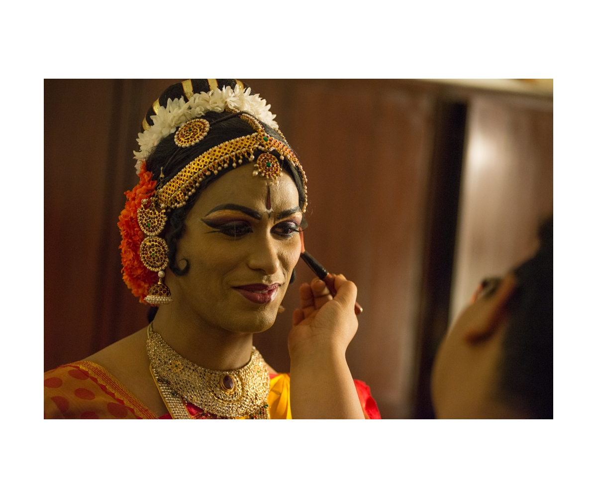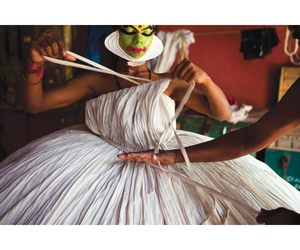 Ornaments and makeup are often part of the visual spectacle of a performance, and in observing performers getting ready, we are able to see a different kind of tactility. For example, in an image of a Kathakali performer in his greenroom, the skin of his face is painted with traditional ‘paccha’ or ‘green’ makeup. The colours are applied patiently onto the face — the skin is still, and the cool, wet natural paint slowly coats it with a sweeping brush in a process that takes hours of work. Each colour determines the character the actor plays. Paccha, for example, represents a pious and noble character, such as the Hindu god Rama from the epic Ramayana, while red represents evil. As his skin ‘touches’ the paint, the actor begins the process of metamorphosing into the character — without this touch, he is not yet a transformed performer, not yet a god.