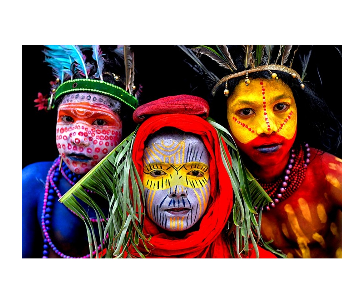 In another image, we see two figures hold up mirrors to their faces, gazing at themselves, completely absorbed in wielding their makeup brushes. They concentrate on the act, carefully adding touches of colour to their faces. Once this process of applying paint, wearing a costume, and looking one last time at the mirror to make finishing fixes is done, they will be ready to perform.