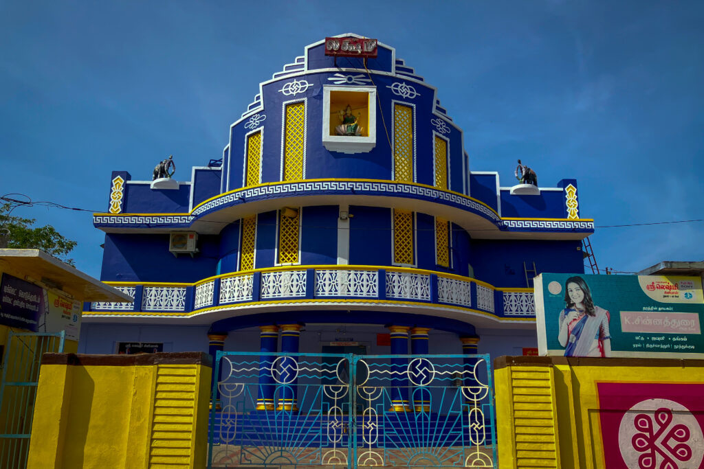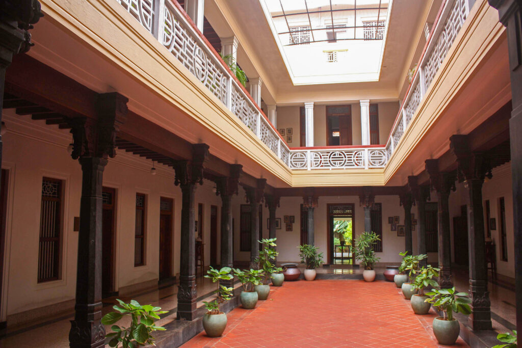 The well-traveled Chettiar community in Tamil Nadu were cosmopolitan in their decorative tastes as well. As a result, their ancestral homes are a potpourri of European and Tamil craft traditions. Traditional Chettiar architecture had already absorbed influences from the Gothic and Art Nouveau styles by the time Art Deco came around, which was also embraced by the community. The palatial mansion, Visalam, in Kanadukanthan, Tamil Nadu, is one example of how Art Deco was assimilated into Chettiar architecture. With the ever familiar stepped facade, the home exterior conforms to the style’s symmetry and visual expression. This is a sharp contrast to the interiors, which remain largely true to the traditional courtyard design of the Chettiars, excepting a few modernist touches in the railings and column ornamentation.