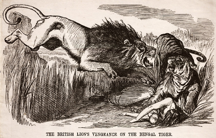 The British Lion’s Vengeance on the Bengal Tiger; Punch cartoon; 1857. Wikimedia Commons