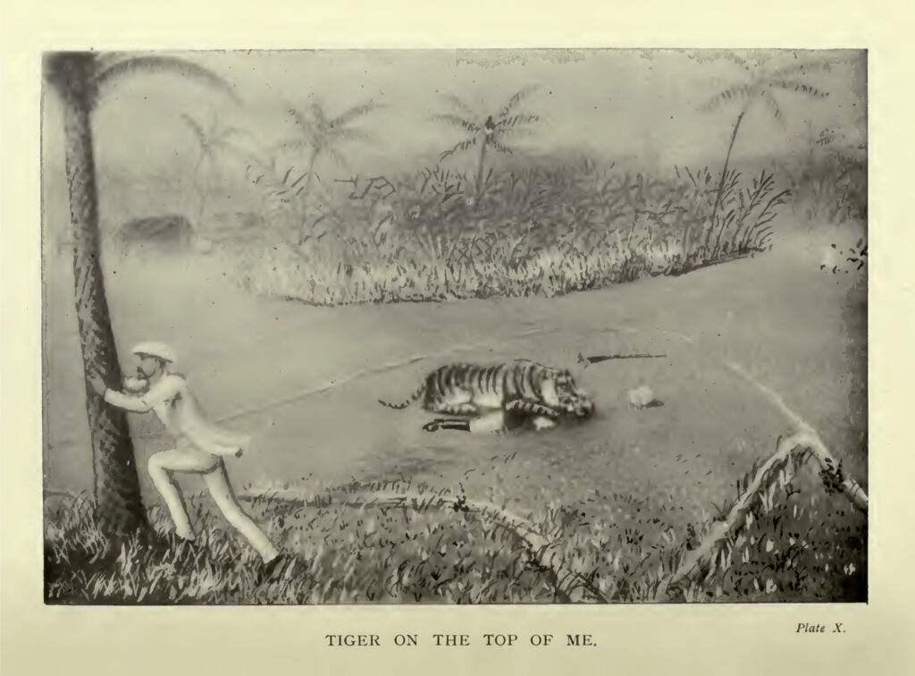 Tiger on Top of Me, Plate X from How I Killed A Tiger: Being an Account of My Encounter with a Royal Bengal Tiger by Lt Colonel Frank Sheffield; 1902. Courtesy Internet Archive