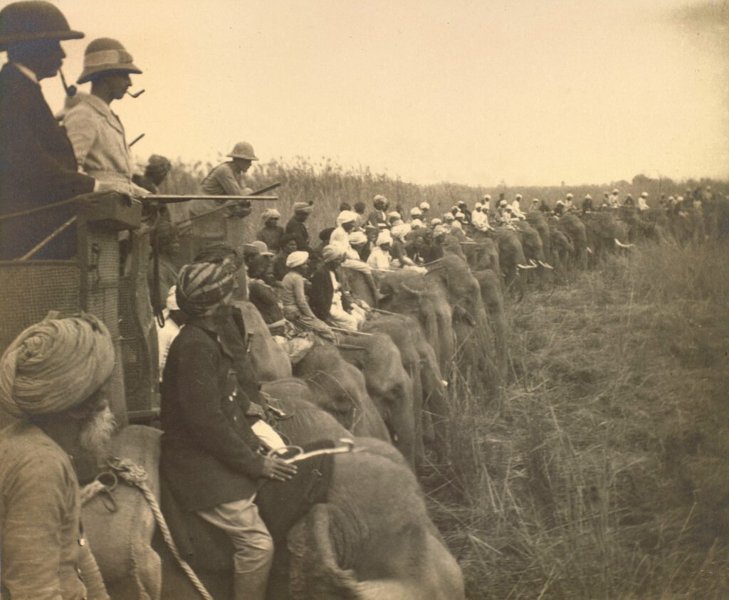 In contrast to Sheffield’s practically solitary contest against the tiger, the image of a hunt from Prince Albert Victor’s 1890 tour of the subcontinent depicts a row of elephants in the Terai region of Nepal, with its royal guest participating in a hunt. Albert Victor was neither the first nor the last visiting dignitary who enjoyed a lavishly organised hunt put together by a princely ruler using local “resources,” such as elephants, beaters, mahouts, and native helpers. These carefully arranged events — as politically motivated as they were forms of leisure — usually ended with the eminent guests posing for images with their hunting “trophy,” which varied depending on the status of the dignitary. A slain tiger, lion, or rhinoceros were coveted but even deers or several hundred birds could serve as trophies of a successful hunt. These images were subsequently published as illustrations in British newspapers or as photographic prints and albums.