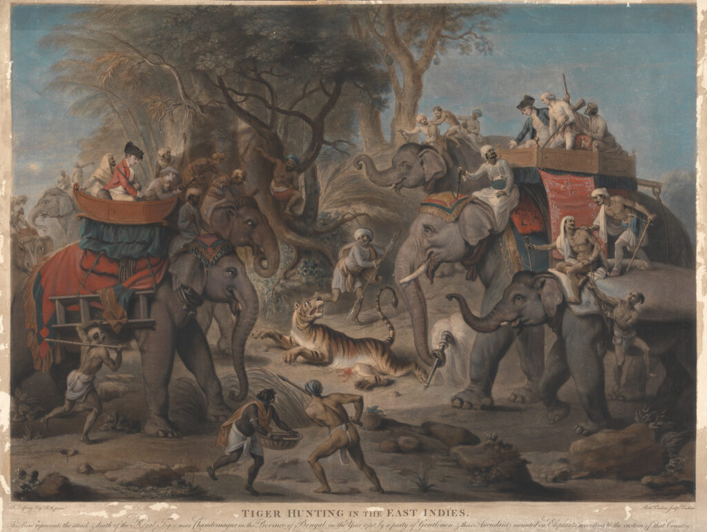 The hunt is almost over. A controlled chaos unfolds and, at the centre of it all, lies a tiger. Blood pooling under its belly, it lets out a roar in its last death throes. The elephants, urged by their mahouts, draw closer. The Englishmen, seated on their backs, strain forward excitedly as the locals, who helped bring in the kill, watch from the sidelines. This is the scene that unfolds in Tiger Hunting in the East Indies (1802), a mezzotint print by the British artist Richard Earlom made from a work by the German painter Johan Zoffany.