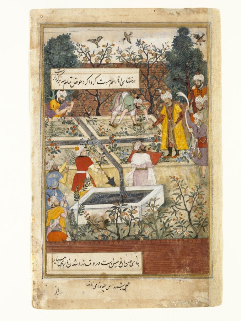 Bazm, or the celebratory parties in Babur’s nomadic court, were also held at beautifully constructed, paradisiacal gardens in his newly conquered territories of “Hindustan.” Bagh-e Vafa (The Garden of Fidelity) in Kabul was one of them, built by the emperor when he was yearning for a ‘taste’ of his homeland. Babur mentions the abundance of orange and pomegranate trees at the site, along with flowering plants, making it an ideal venue for him to host numerous wine and ma’jun parties. A double folio in the Baburnama, painted by Bishandas, shows the emperor overlooking the construction of the garden that clearly depicts its two main fruiting trees.