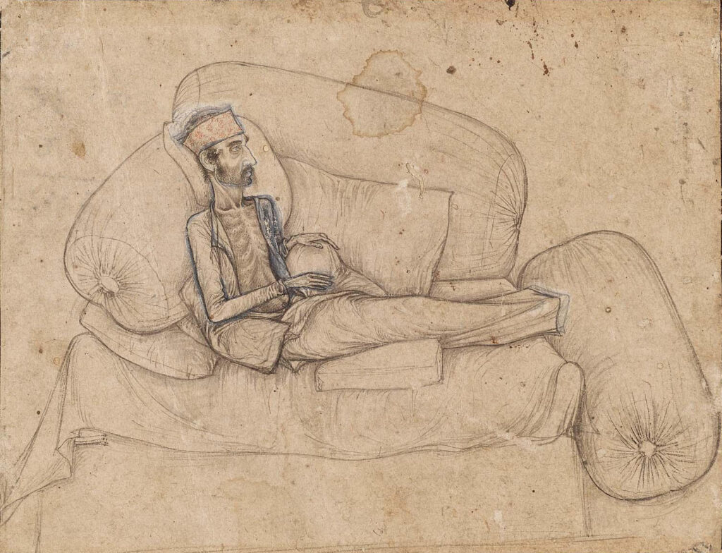 Inayat Khan’s portrait is an especially rare example of Mughal art because of its unsettlingly realistic depiction — a deviation from the generally favoured idealism in Mughal court paintings. Two versions exist — both attributed to Balchand — that depict Khan, emaciated and propped up with the support of high bolsters. Khan died the day after Balchand had forever memorialised him as The Dying Inayat Khan.