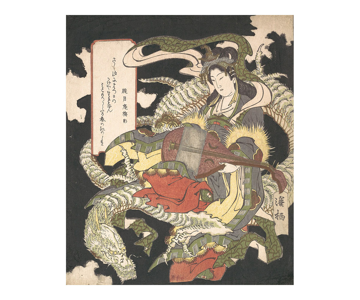 Benzaiten (Goddess of Music and Good Fortune) Seated on a White Dragon; Aoigaoka Keisei, Japan; c. 1832; Woodblock print (surimono), ink and colour on paper; 21.6 x 18.4 cm; The Metropolitan Museum of Art