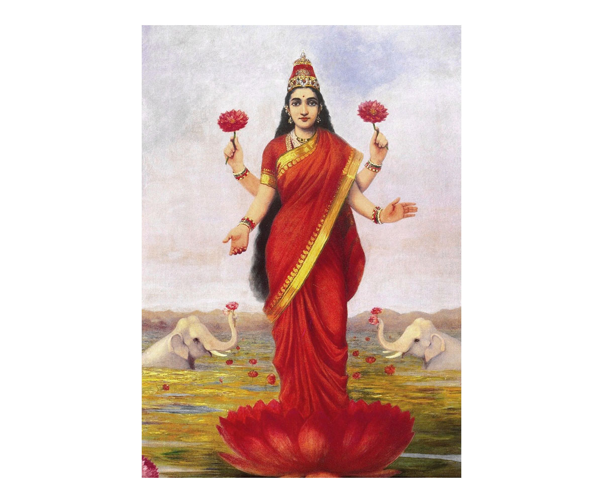 Goddess Lakshmi Standing on a Lotus; Raja Ravi Varma; c. 1896; Oil on canvas; Maharaja Fateh Singh Museum, Wikimedia Commons