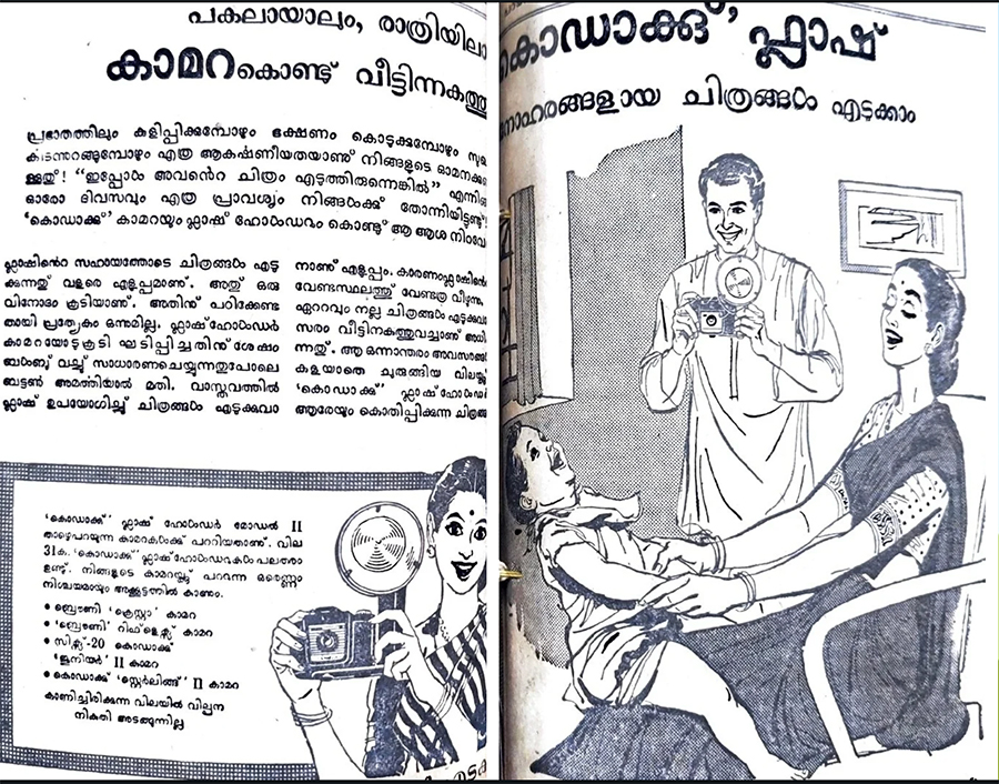 But all that changed after India’s independence. By the 1950s, the imagery of ads placed in regional Indian newspapers, periodicals, and magazines saw a dramatic transformation. To capture the new market, the Western Kodak Girl was reimagined as Indian. Clad in a striped sari, she sported key cultural markers of local femininity like the bindi, bangles and jasmine flowers. After the formation of linguistic states in India by 1956, Kodak also began incorporating vernacular languages in regional ads, moving beyond the exclusive use of English.