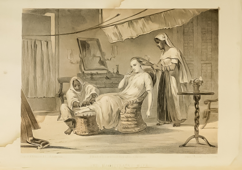 Memsahib attended by servants, an illustration from the satirical book Curry and Rice on Forty Plates by G F Atkinson; India; 1859. Courtesy Internet Archive