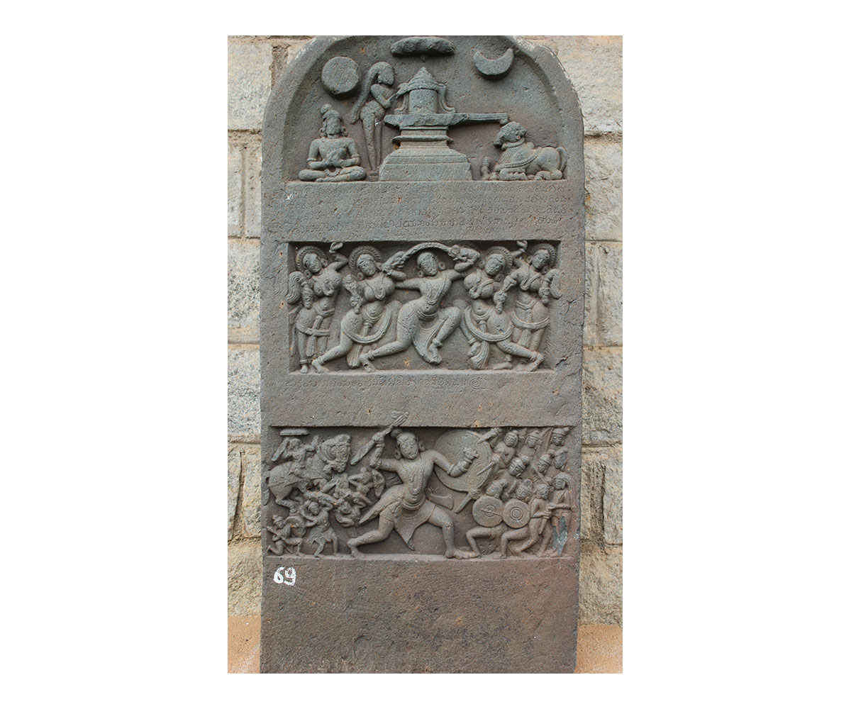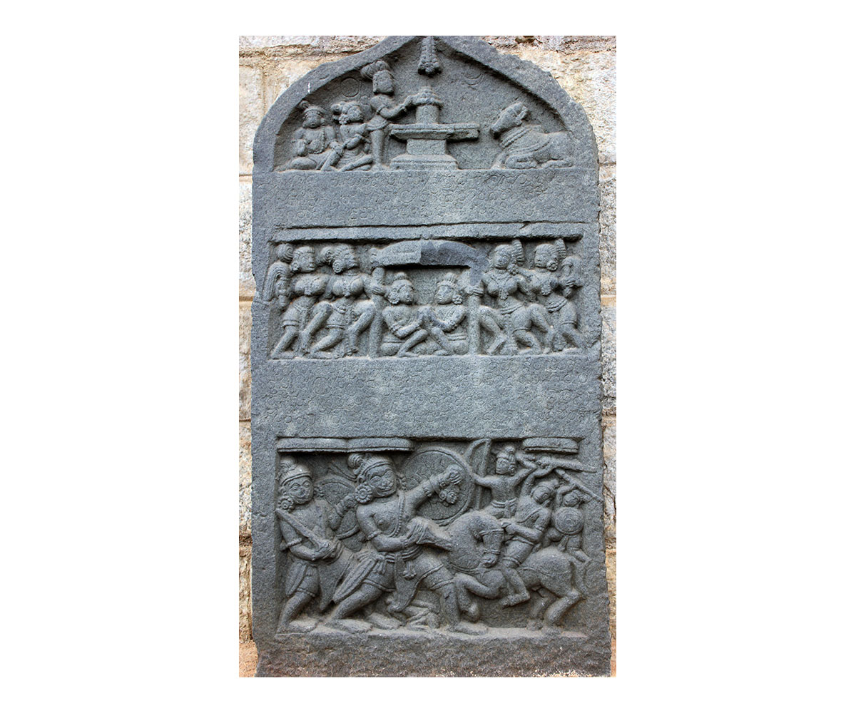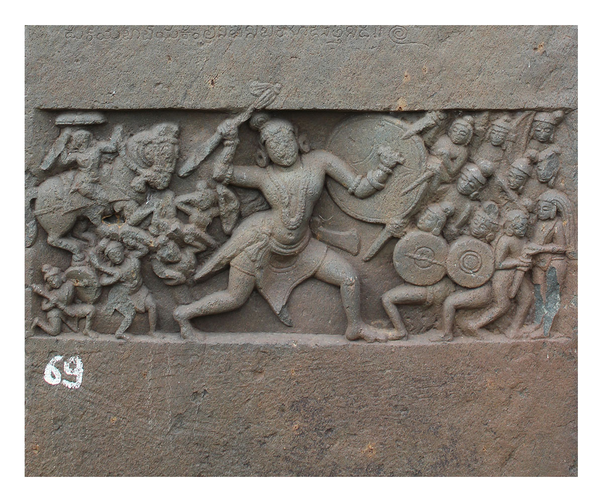 Hero stones can be seen as part of a spectrum of art historical material related to the performance and commemoration of military activity. This ranges from forgotten foot soldiers, who composed the bulk of armies; through the minor aristocrats who commanded them and sought to attract attention and rewards through duels and brave deaths; to the handful of powerful nobles fighting on elephant-back, who were commemorated by the construction of entire temples. The crucial role of foot soldiers is ignored in martial records while minor aristocrats are depicted killing squadrons of enemies. Kings and generals are described as destroying entire armies and cities, supposedly decimating populations through their individual martial prowess. Aristocrats’ hero stones were worshipped with offerings of blood, rice, and incense, and warriors went into dance-induced trances there before battle, supposedly being possessed by the spirits of the dead. Similarly, the temples of royals were the sites of enormously complex ritual activity with iconographic programmes dedicated to the conquering king.