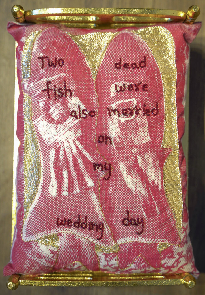 These questions tie into marriage, the migration that follows, the loss of identity, and the feeling of not belonging anywhere. The most dangerous thing is that this is normalised. Not just normalised, but celebrated! It is also this “celebration” that I wanted to critique. The use of gold, golden threads, and glass beads satirises the excesses of a wedding — of the glitter and festivity that surrounds an occasion where, in reality, someone’s identity is being erased.