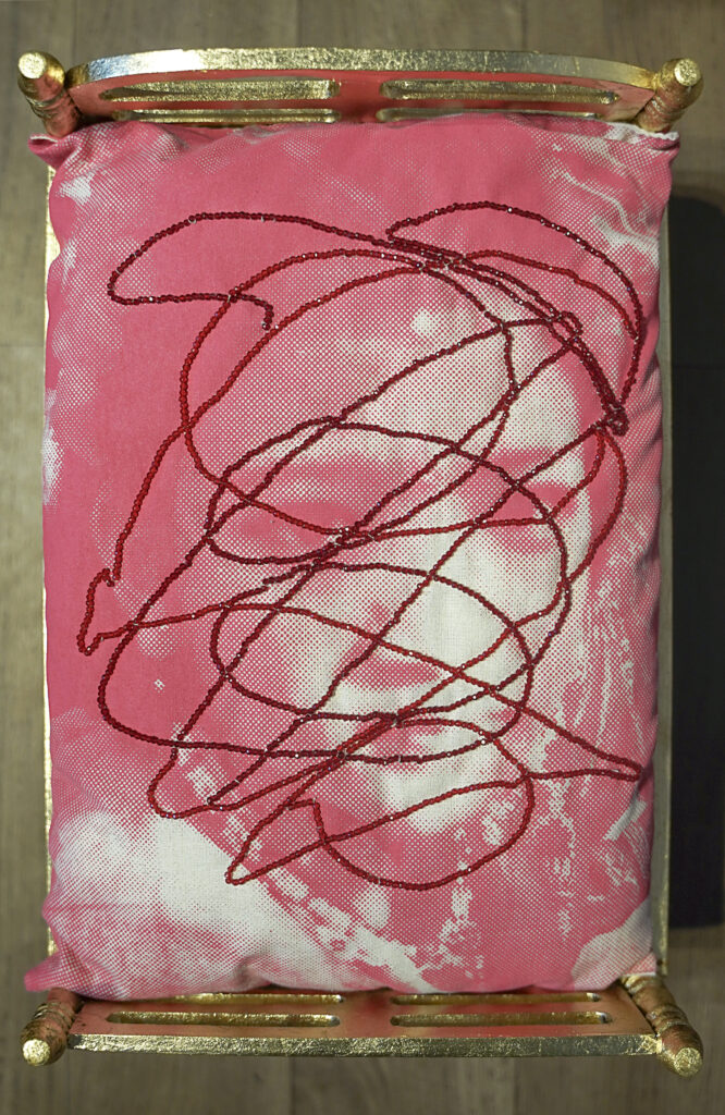 Agony of the New Bed; Sheelasha Rajbhandari; 2018; Installation with imitation gold leaf on wood, digital print on linen cotton textile, embroidery thread, metal thread, glass beads. Courtesy Artree Nepal
