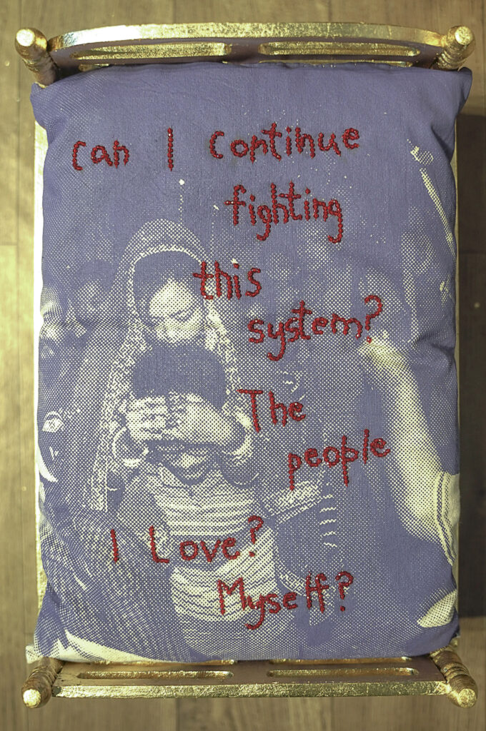 This body of work is such an important marker in my life — to have this work come out of my head and body; to be able to do what I wasn’t able to do ten years ago. In the initial years, there was a lot of frustration in my inability to express what I was feeling. Now it feels like I’ve come to peace with the things that bothered me. The embroidered text in one of the mattresses reads “Can I continue fighting this system? The people I love? Myself?” I reached a point where I was tired of fighting the people I love. It’s often easier to fight others but when the struggle involves the people you care about, it becomes far more complicated. At some point, I found myself wondering, “How long can I continue to fight the battle, especially with the people I love. I began to feel like I was fighting myself.”