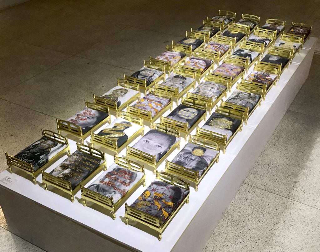 The installation has thirty miniature beds, painted in gold, their mattresses screen printed with black and white photos of women, many of them from weddings. The printed mattresses are overlaid with embroidered texts, scribbles, and patterns. Using both personal archives and textiles, Rajbhandari created this dollhouse-like artwork to explore the position of women in different times, landscapes, and cosmologies. Her aim was to mount an incisive critique of the patriarchal structures in Nepal, particularly the institution of marriage. She used embroidery — once forced upon women to please the families they marry into — as a form of catharsis. The slow, precise movements of the hand, employed in crafting domestic knick-knacks, are reimagined as tools to pick apart the same system that seek to confine women.