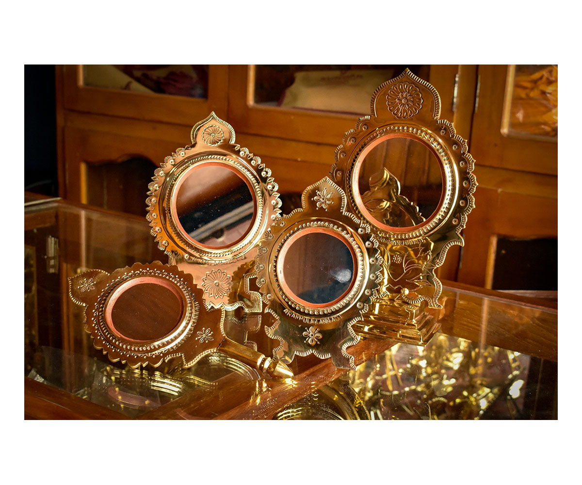 One of the eight auspicious objects, or ashtamangala used in Hindu ceremonies in Kerala is a special hand-held mirror known as val kannadi or aranmula kannati which occupies an important place in various rituals marking important life events. Crafted in the small town of Aranmula by Musari artisans, these mirrors are made using a bronze alloy that remains an exclusive secret. During the Vishu festival that marks the day when farmers sow the first of their seasonal paddy, children participate in the vishukkani, a ritual viewing of oneself in the mirror. They are taken blindfolded into a room and the first things they see are the eight auspicious objects that bring good luck and prosperity, one amongst them being the mirror, and thus, themselves.