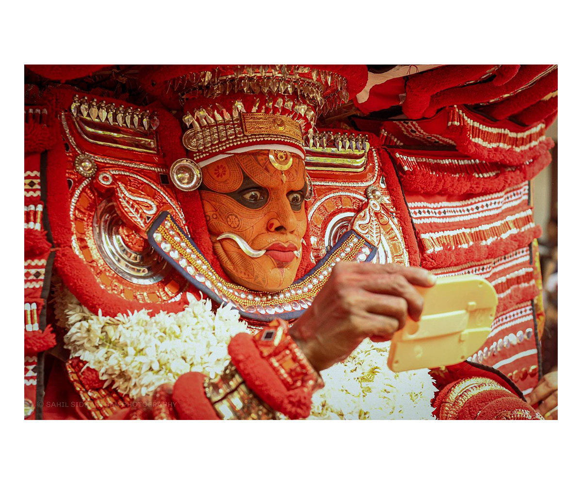 In parts of Kerala, mirrors also hold important ceremonial value. They are closely linked to performance traditions such as Theyyam, and martial arts such as Kalaripayattu. As part of their ritual practices, Kalari practitioners set up a mirror in the corner of the arena, along with a sword and shield, and offer prayers to it before a performance. During the initial stages of a Theyyam performance, the performers dress themselves as gods, in elaborate costumes and jewellery. Once their physical or external form is transformed into the deity through their dress, they hold up a mirror, known as the ‘nookodi’, and gaze into it. This act of looking at the self, helps the performer to invoke and come into their internal transformation into the deity.